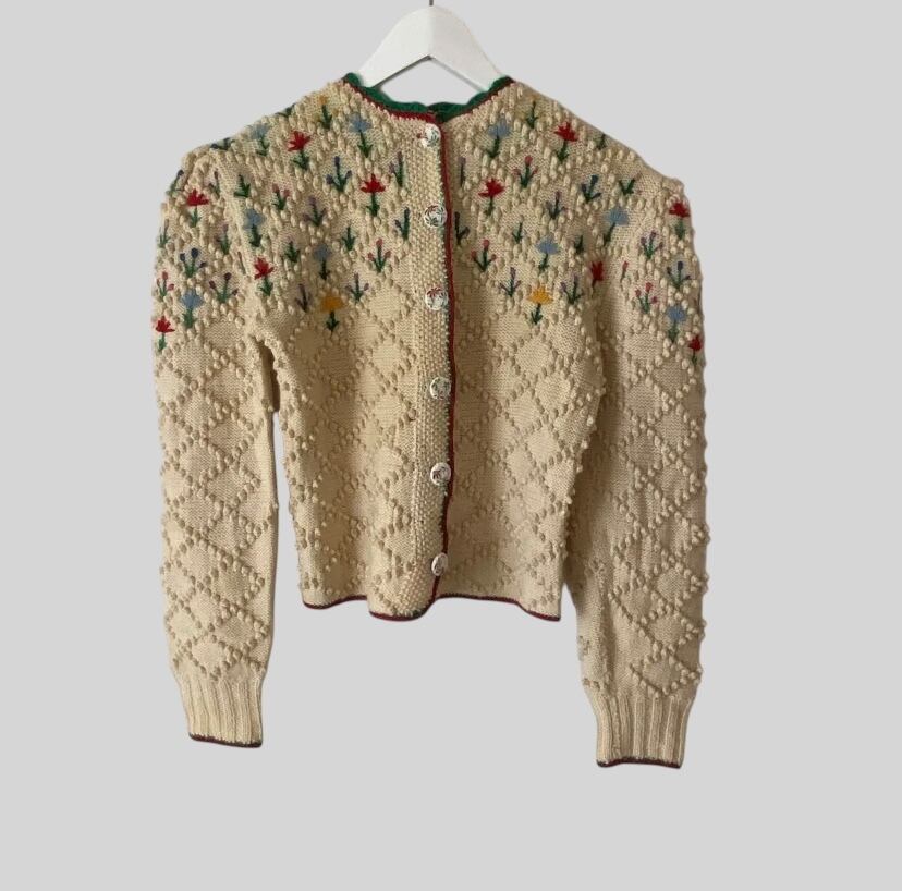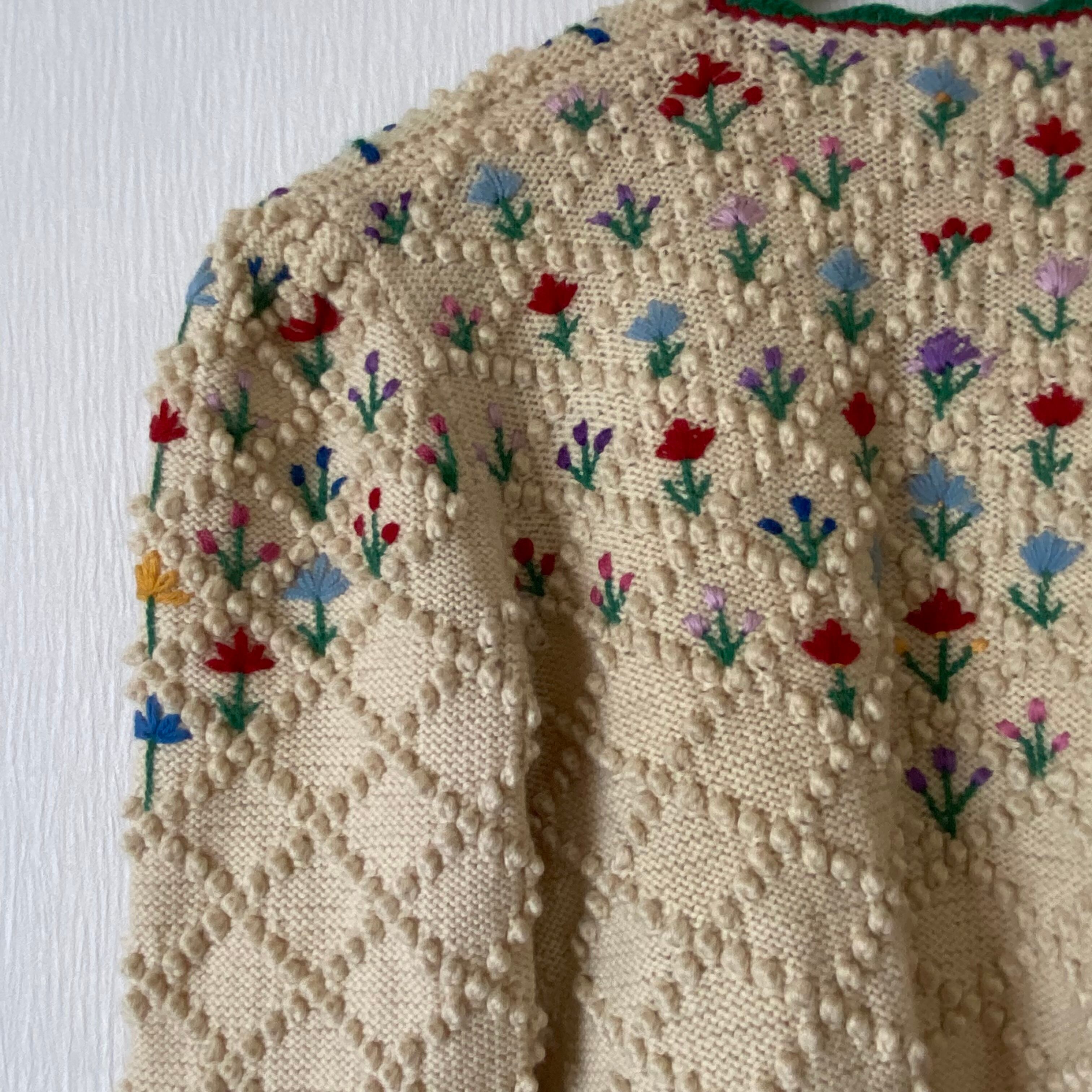 お花の模様と、肩がパワショルになるようにデザインされて編まれているのでとてもスペシャルな1点です!