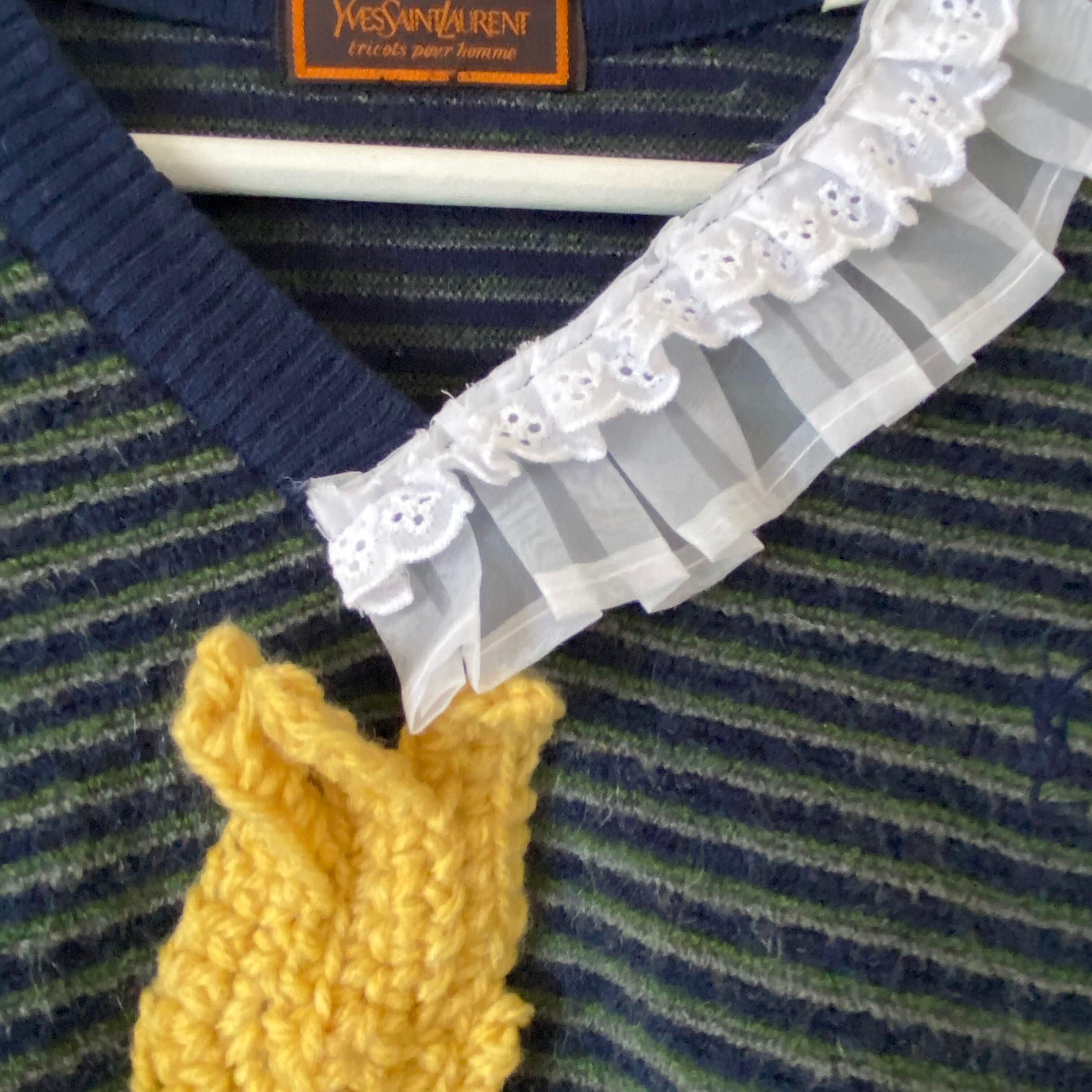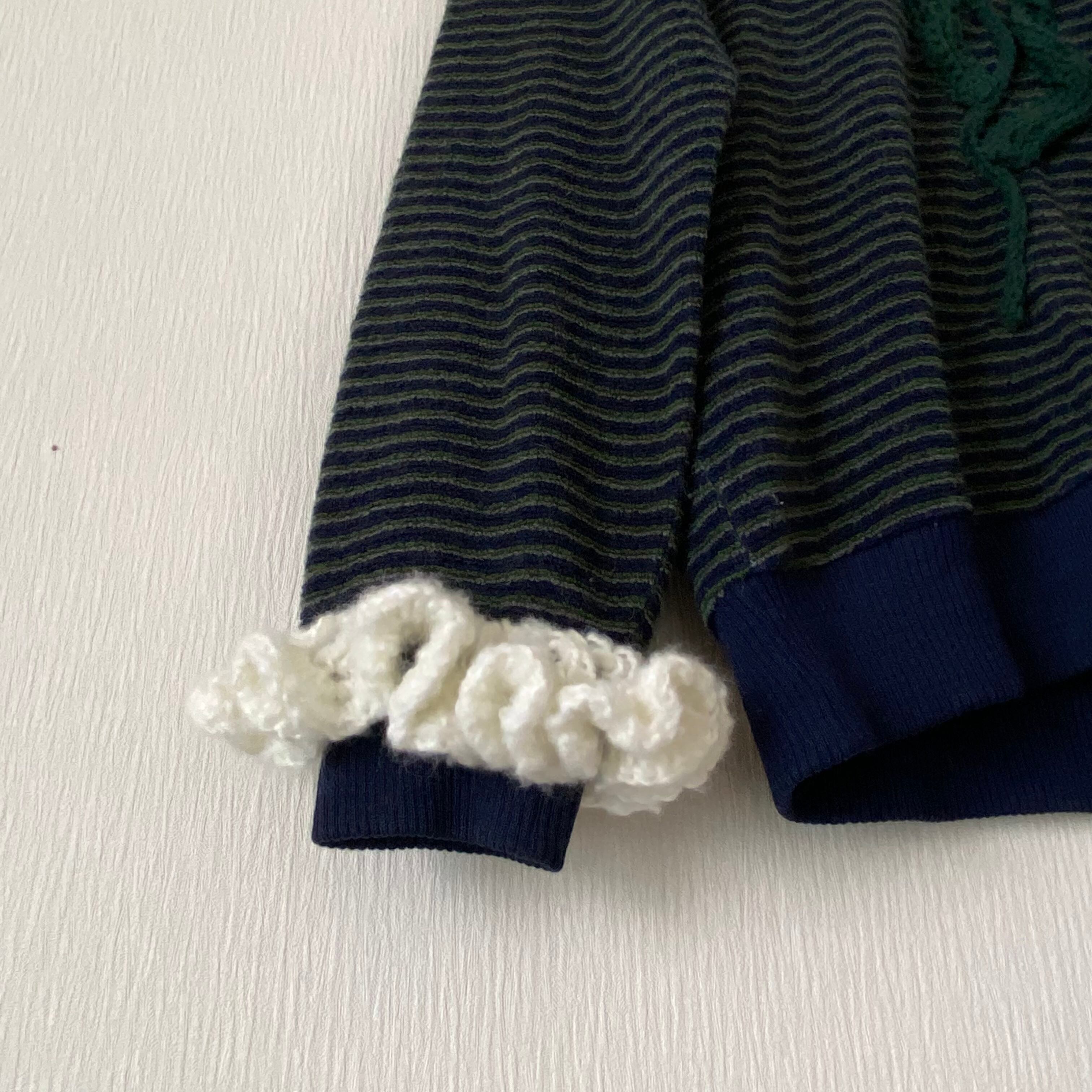 胸元に小さなロゴの刺繍と、グリーンとネイビーの