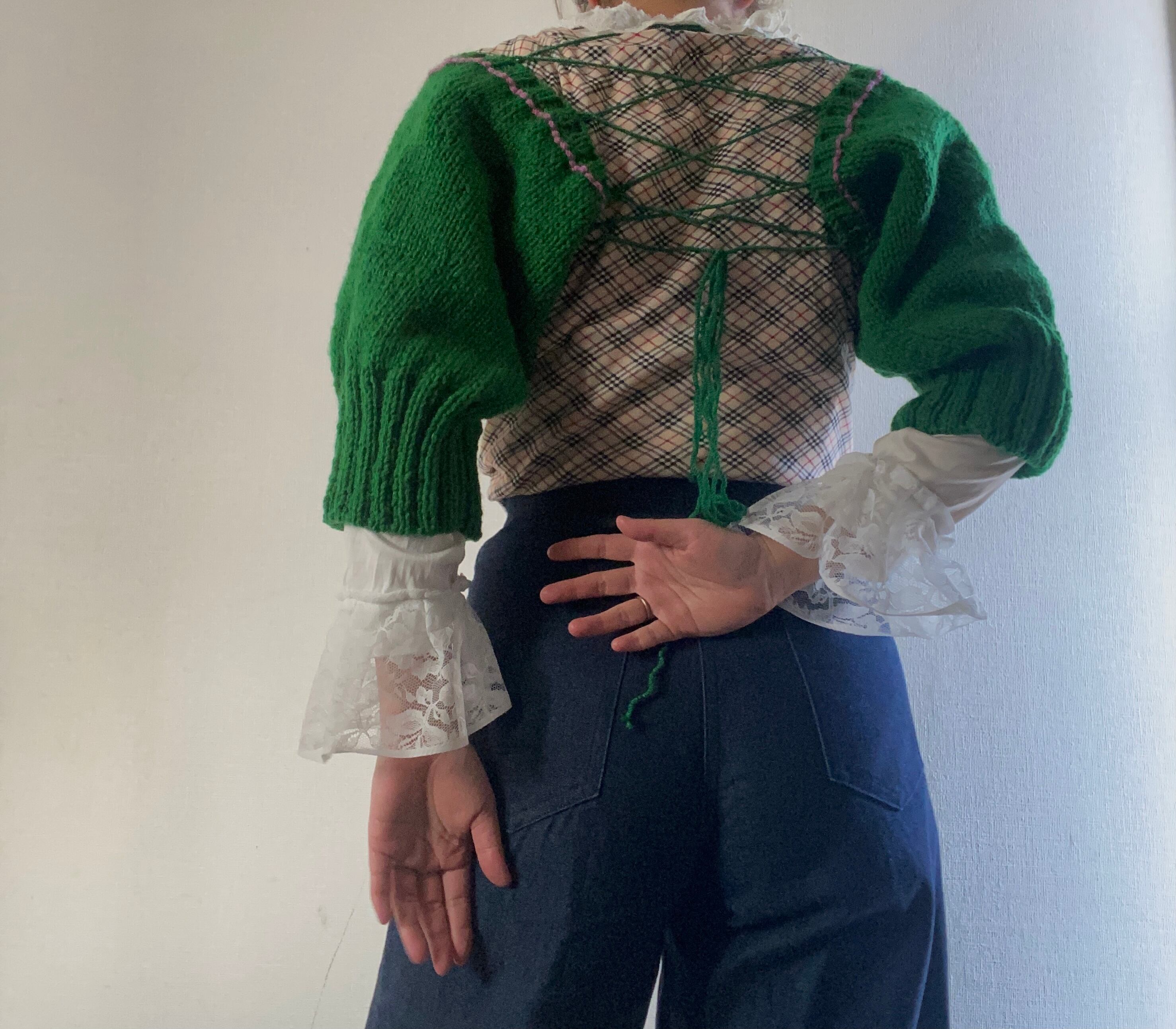 袖部分だけを編み、後ろは紐で繋げた